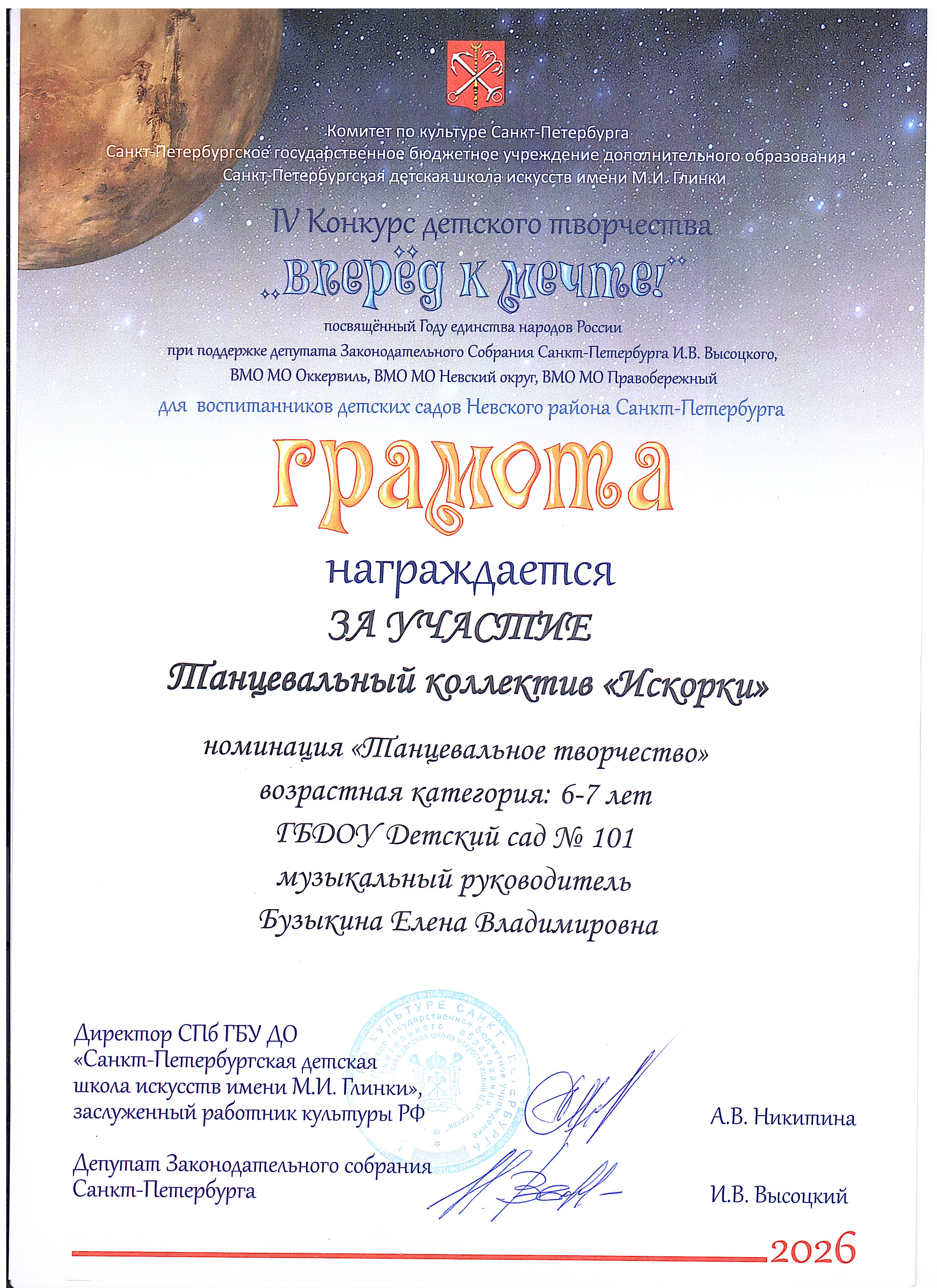 ГРАМОТА ЗА УЧАСТИЕ_ТАНЦЕВАЛЬНЫЙ КОЛЛЕКТИВ "ИСКОРКИ" 6-7 ЛЕТ_НОМИНАЦИЯ "ТАНЦЕВАЛЬНОЕ ТВОРЧЕСТВО" Открыть | Скачать (jpg, 2150.1 Кб) |