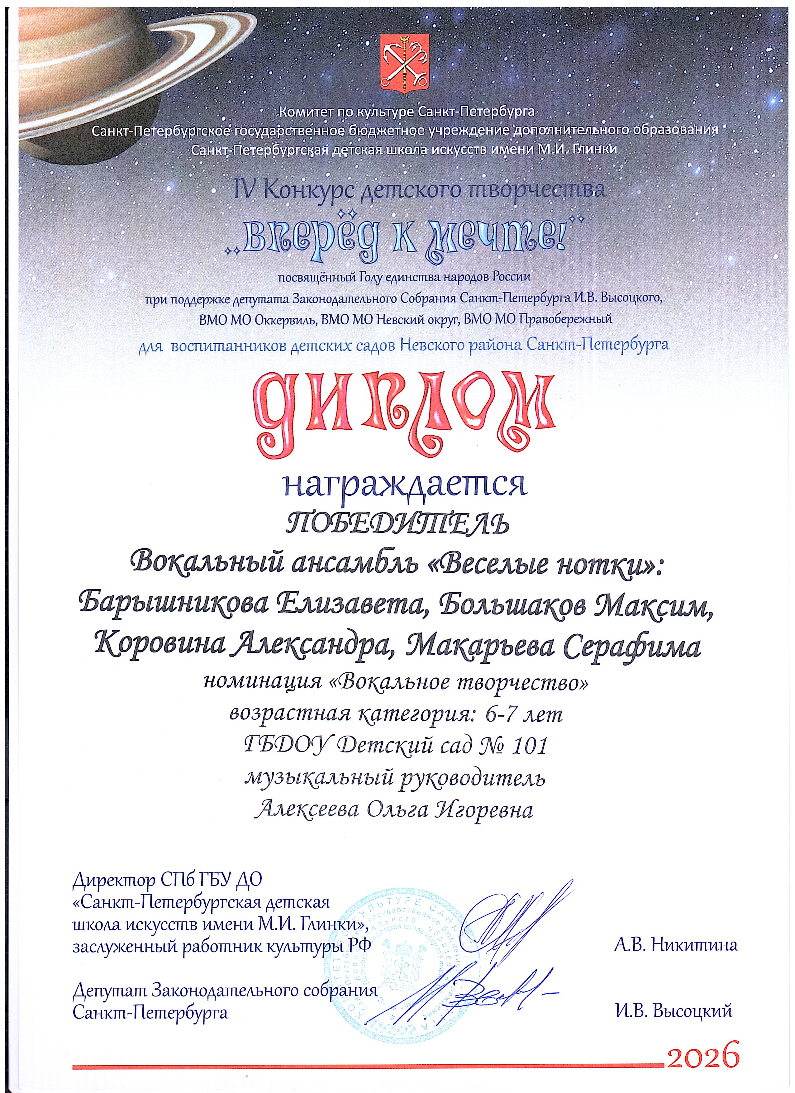 ДИПЛОМ ПОБЕДИТЕЛЯ_ВОКАЛЬНЫЙ АНСАМБЛЬ" ВЕСЕЛЫЕ НОТКИ" 6-7 ЛЕТ_НОМИНАЦИЯ "ВОКАЛЬНОЕ ТВОРЧЕСТВО" Открыть | Скачать (jpg, 2287.7 Кб) |