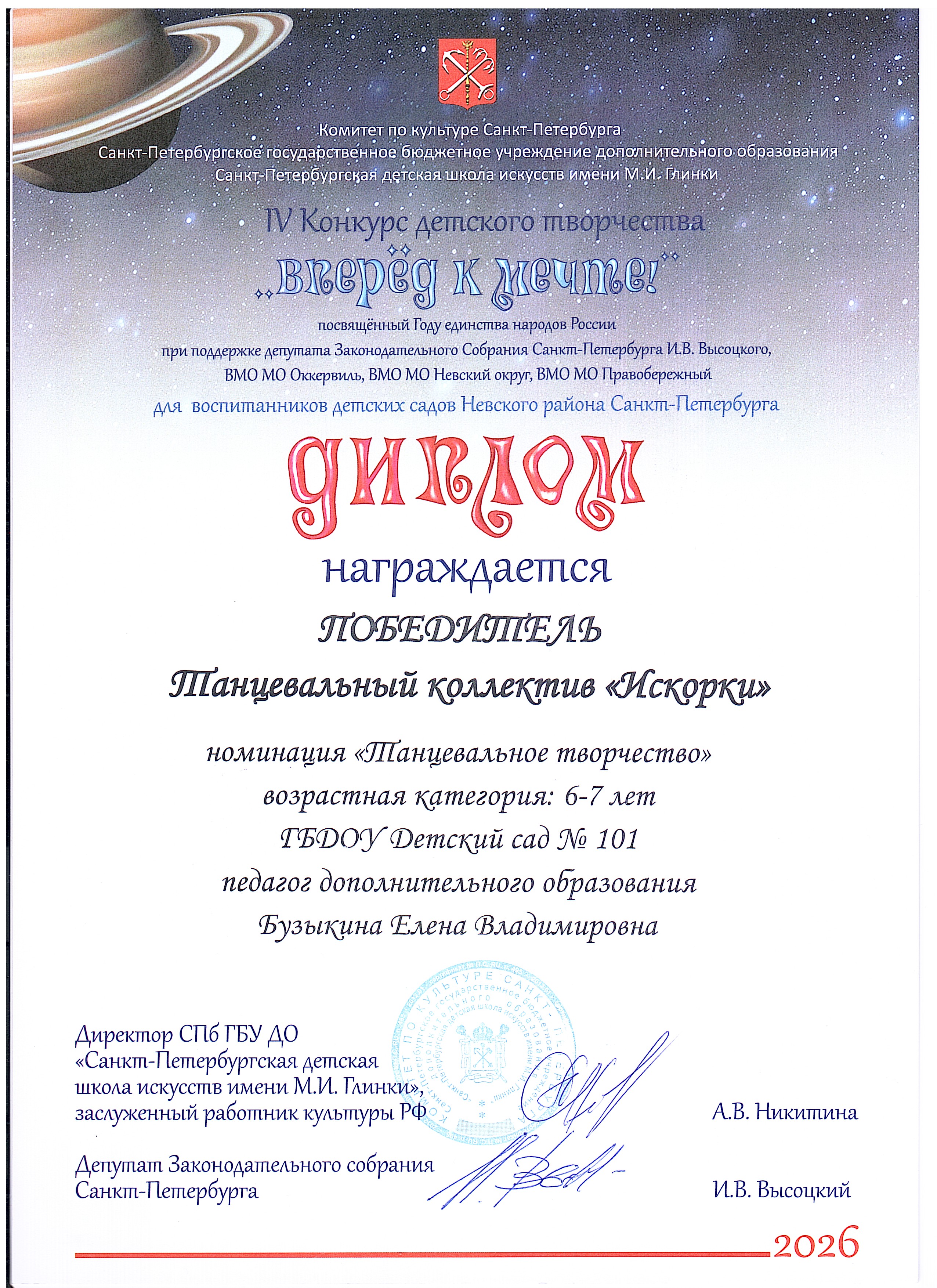 ДИПЛОМ ПОБЕДИТЕЛЯ_ТАНЦЕВАЛЬНЫЙ КОЛЛЕКТИВ "ИСКОРКА" 4-5 ЛЕТ_НОМИНАЦИЯ "ТАНЦЕВАЛЬНОЕ ТВОРЧЕСТВО" Открыть | Скачать (jpg, 2199.9 Кб) |